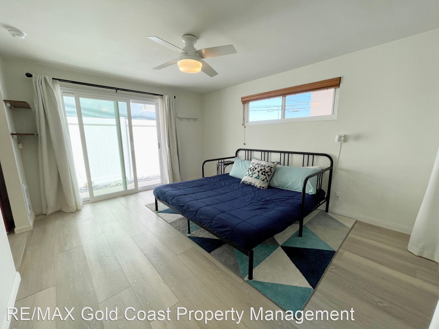 Back on the first floor, you will find the second bedroom that has a king-sized futon that can also be converted into a twin bed. In the room is also a refrigerator, sink and en suite full bathroom! The sliding glass doors offer access to the back patio space.