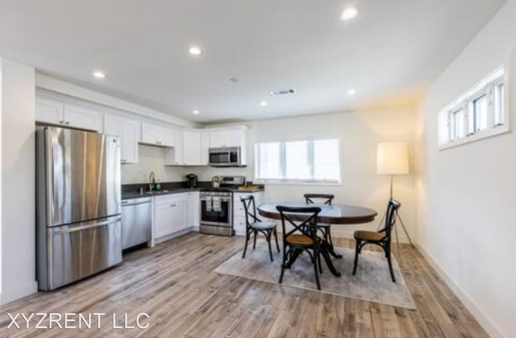 Large living, dining and kitchen open floor plan. All stainless steel appliances fridge, dishwasher, and stove.