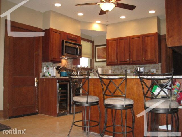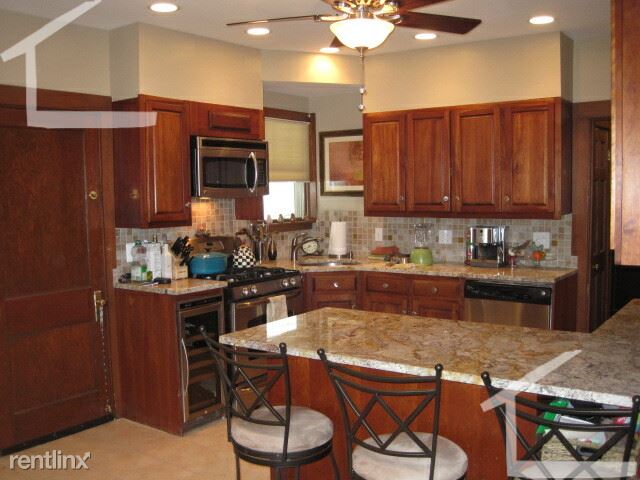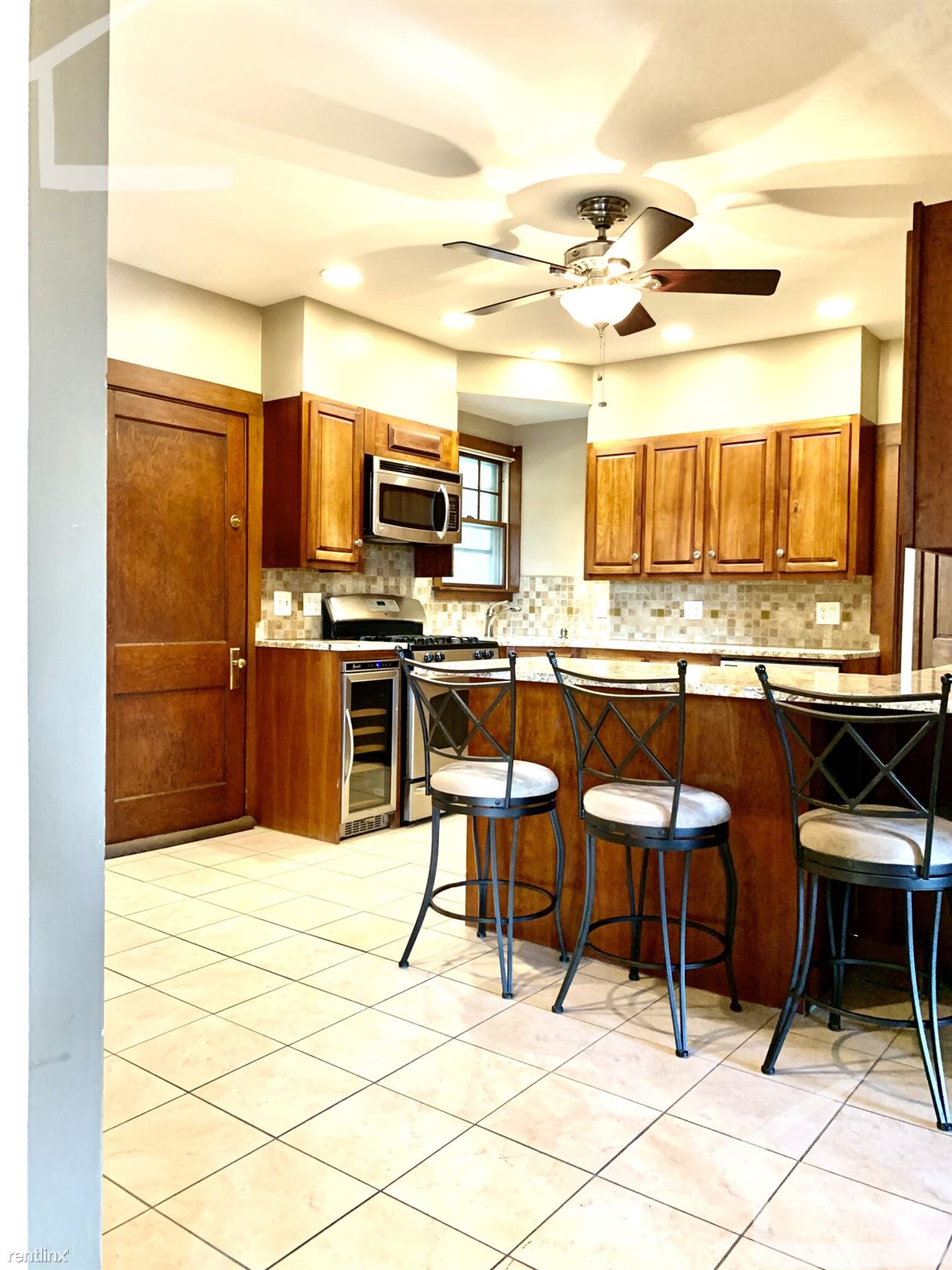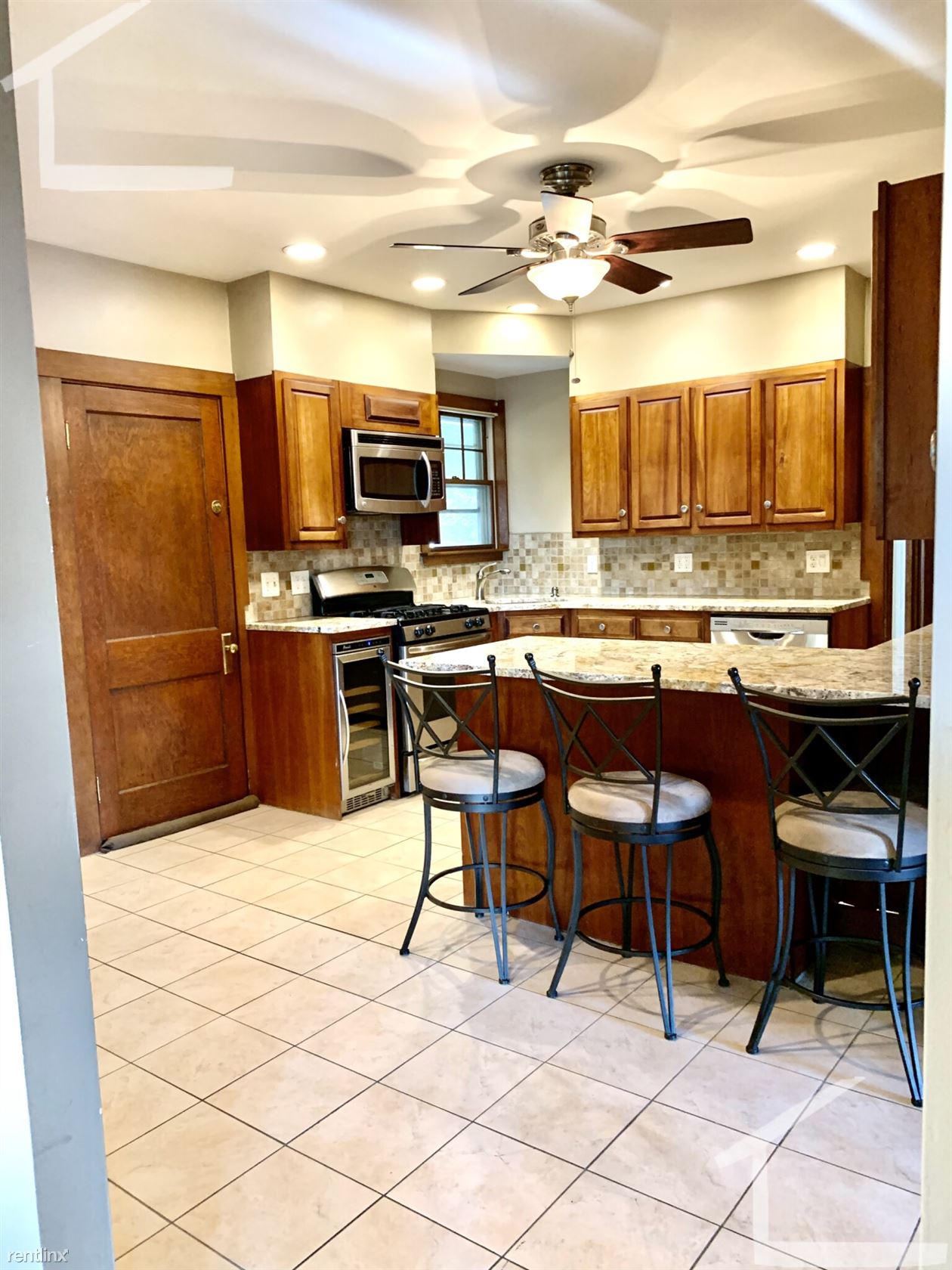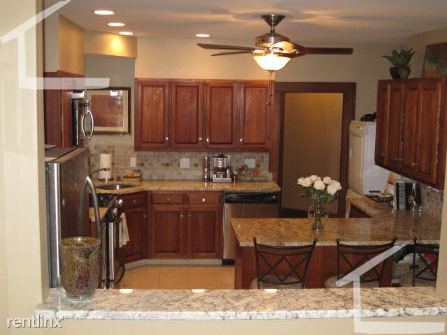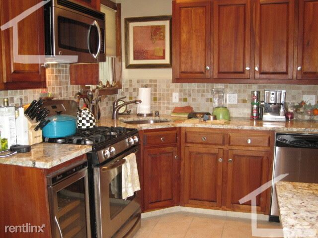 Renovated kitchen with granite, stainless steel appliances including stackable free laundry in unit.