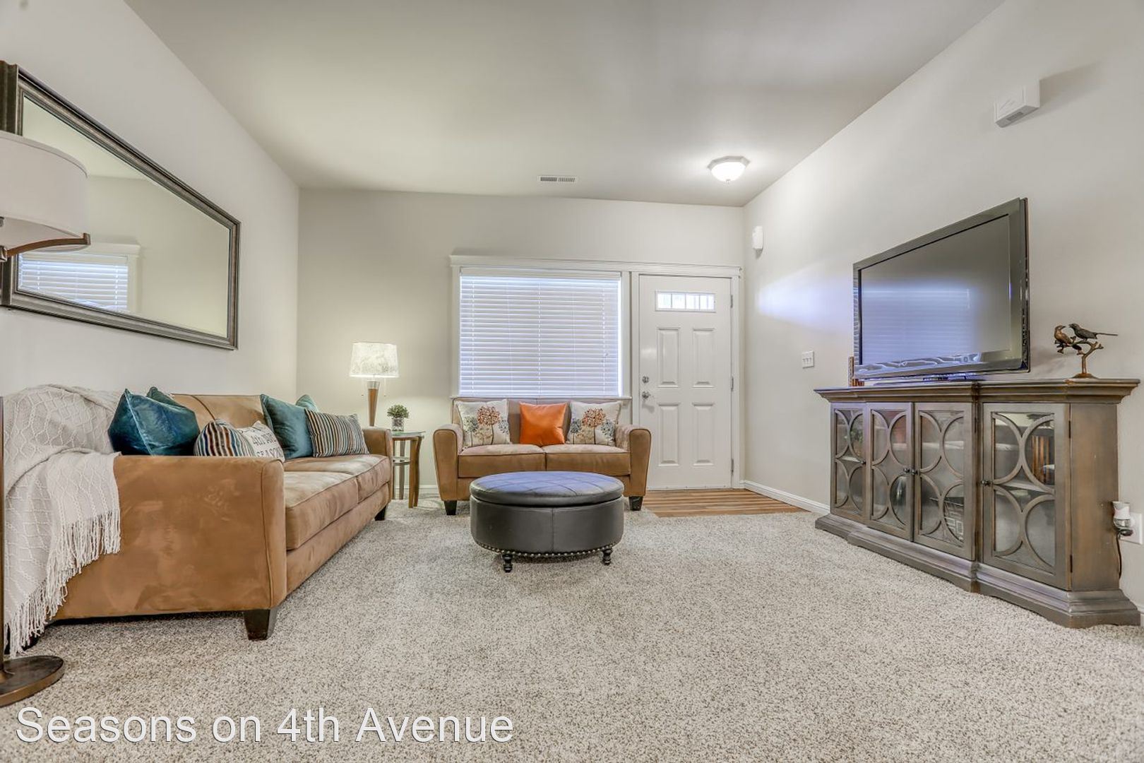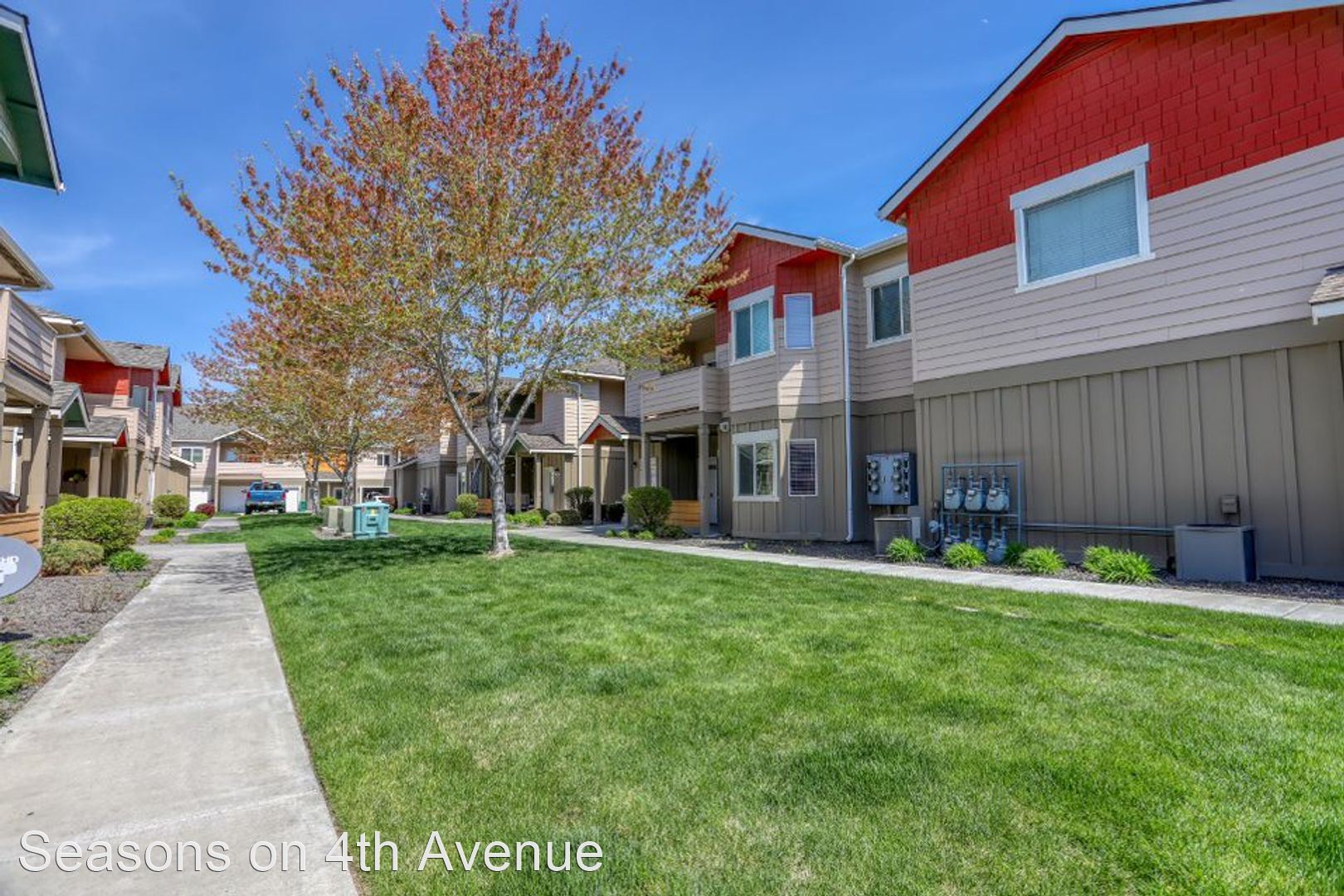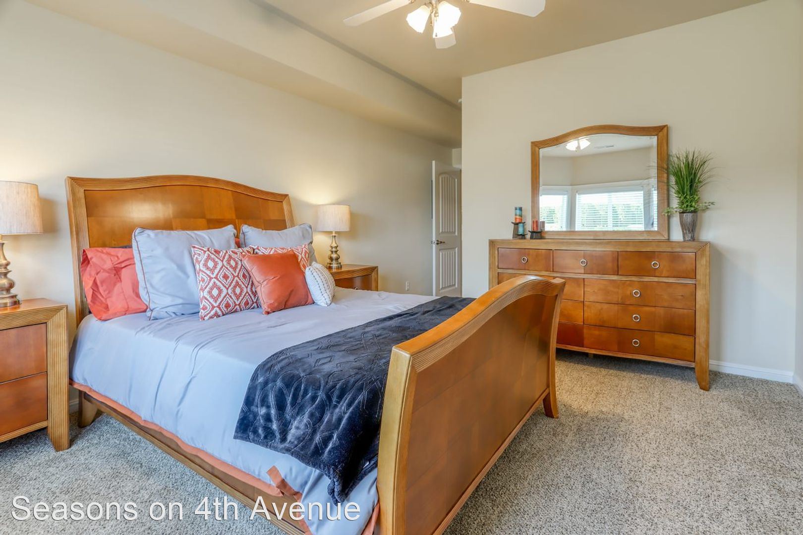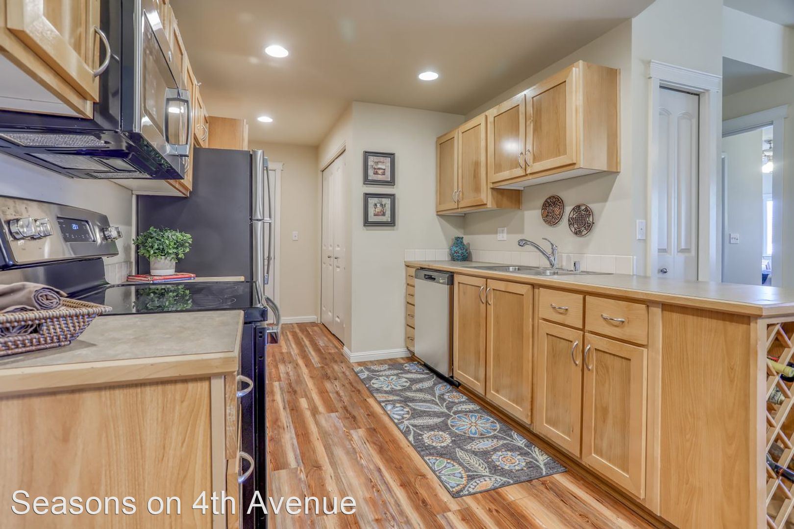 Condo Style Living On Ground Floor with Attached Garage! - Visit our website: https://seasonson4th.com Our 3 bedroom/2 bathroom plan has 1233 square feet perfectly laid out to maximize your space. The master bedroom has a big bay window and an extra-large walk-in closet. The second and third bedrooms are comfortably sized. The second bathroom is oversized with extra counter space and lots of drawers. Kitchen with oak cabinetry includes a wine rack and dining room that opens to the extra-large living room. This apartment home has an attached garage with a remote along with a parking pad, therefore, nobody can ever block you in. Every home has central heat/air, 9’ ceilings, hardwood flooring in the kitchen and custom tile in the entryways, all appliances including full-size washer/dryer, glass top stove, and large walk-in closets. Our community offers daily coffee, 24-hour fitness center, pool & spa, car wash station, bbq pits, and picnic tables. Plus, choose from 5 custom colors for your free accent wall when you sign a 12 month lease!!